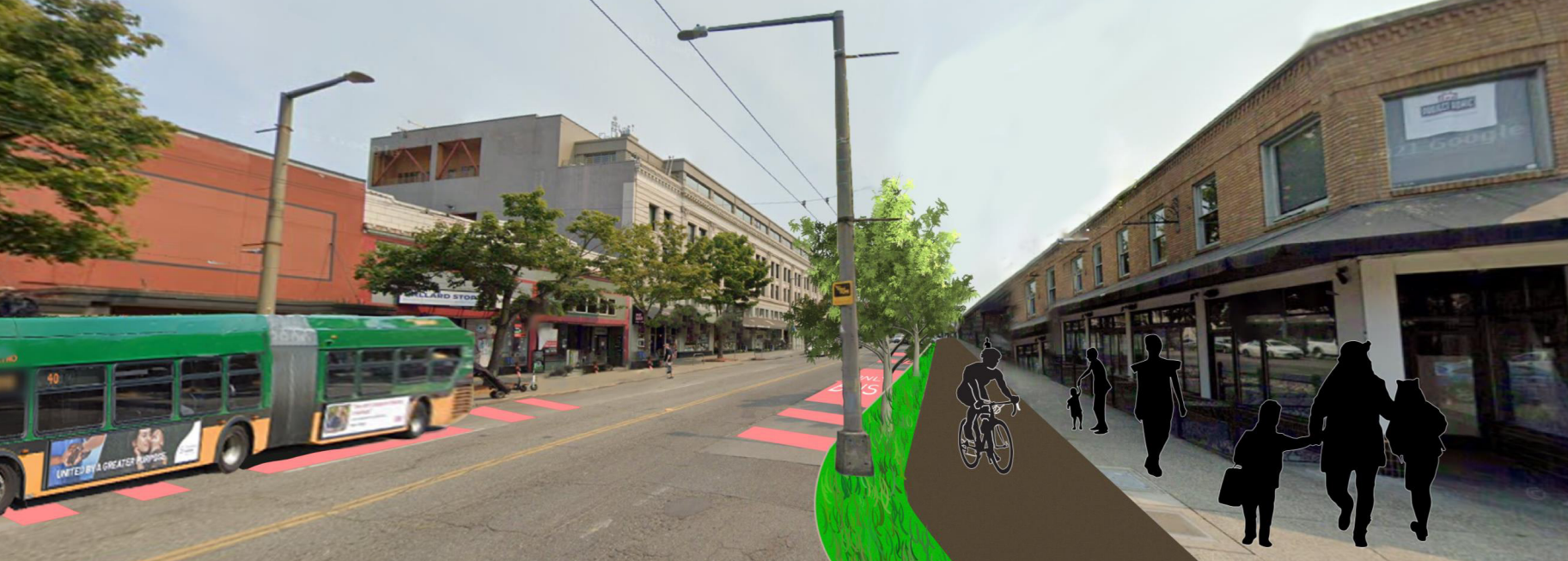 Tom Fuculoro at the Seattle Bike Blog put it very well while covering the design flaws here, which look to cram the people who should be most prioritized on Market Street into one narrow area. “All these trade-offs and compromises are happening within the already-limited walking realm,” Fuculoro wrote last week. “But why are engineers so focused on preserving a four-lane design for a street running through a major business district with such high levels of foot traffic? Instead of pushing compromises onto the walking, biking and transit user spaces (not to mention the trees), let’s see some design ideas that utilize some of the 51 feet of roadway space.”