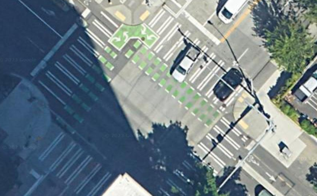 To bike to Climate Pledge Arena, home of two of Seattle’s professional sports teams as well as dozens of concerts per year, from Downtown Seattle, people using the city’s flagship protected bike lane on 2nd Avenue are routed around the west side of Seattle Center via 1st Avenue N. To make that connection via Broad Street, riders must take a left turn by entering the intersection at 2nd and Broad and waiting in a painted box for the light to turn green. That box holds two bikes, three with a lot of effort. If a fair number of people try to make the turn at the same time, they have to decide whether to hang into the intersection as drivers turn left from 2nd Avenue onto Broad Street, or wait for the next light cycle.