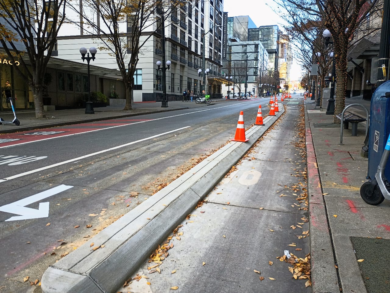 A bike route between Capitol Hill and Pike Place Market is one that clearly needs to accommodate a lot of riders. And yet the protected bike lane being installed right now on Pine Street varies quite a bit in terms of its width on different blocks downtown. Between 7th Avenue and 6th Avenue it narrows to about four-feet wide, raising questions about the city’s ability to maintain it with the electric bike lane sweeper.
