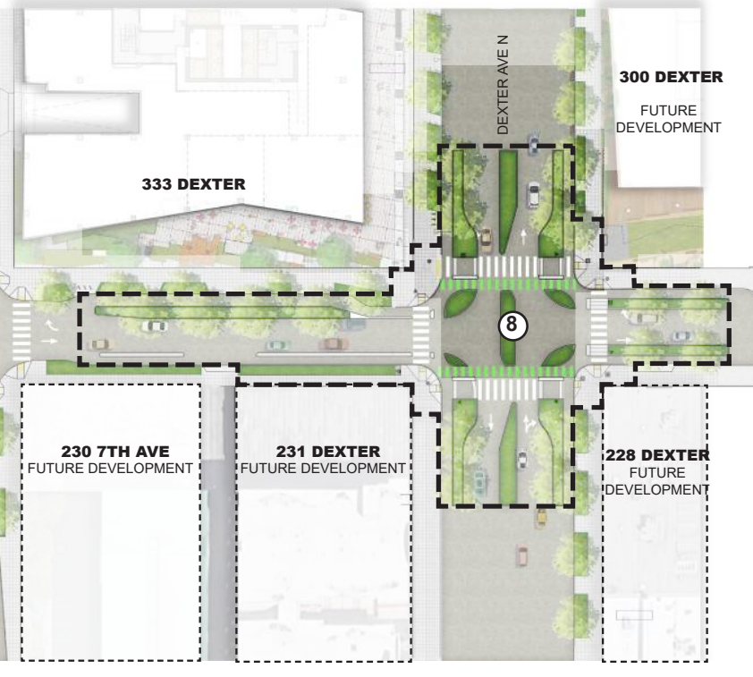 The protected intersection is one element of a corridor improvement project along Thomas Street, one that Mayor Bruce Harrell diverted funding away from in his first budget last fall. As a result, instead of a permanent diverter plaza at 5th Avenue N, city crews will instead construct a quick-build plaza with some street furniture separately from the work being bid closer to Dexter Avenue N. Funds to fully upgrade this to something lasting and more durable will need to be found elsewhere. But for now, the plaza will serve its primary function of diverting vehicle traffic trying to use Thomas Street as a cut through. Both the temporary plaza and the permanent improvements around Dexter are set to be installed this fall, barring delays.