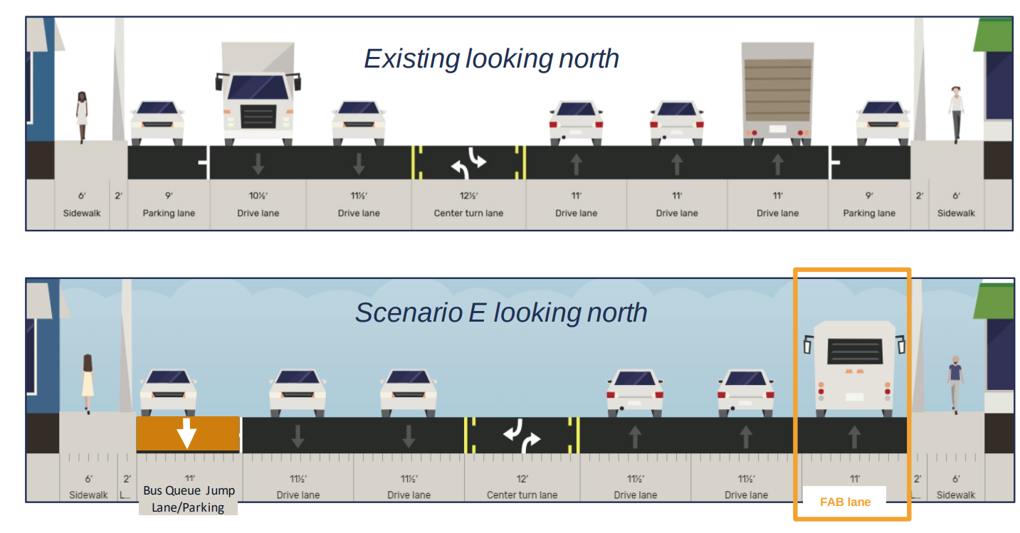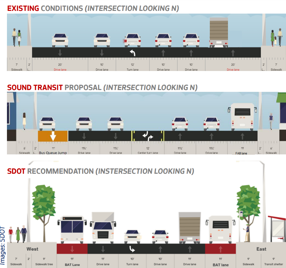 Nonetheless, the initial proposal from Sound Transit, produced in coordination with the Seattle Department of Transportation (SDOT) and other partners like the Port of Seattle, would largely leave 4th Avenue S as it exists today. Apart from a short freight-and-bus (FAB) lane for northbound traffic only starting just south of S Lander Street and ending at S Holgate Street, buses would share space with general purpose traffic. Bus queue jumps at intersections would give buses a head start at Holgate and Lander when heading southbound.