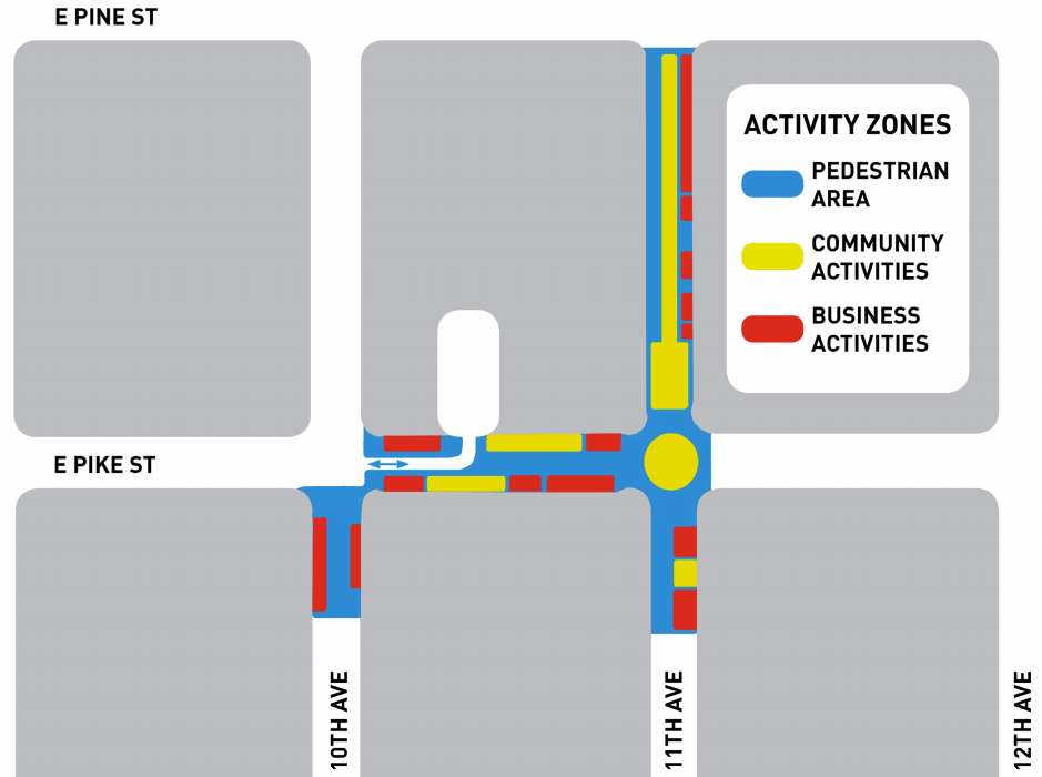Capitol Hill was specifically cited as a place where “European style” street treatments could be implemented — despite a track record of failing to get traction for such programs in the neighborhood or from city hall. From 2016 to 2018, SDOT piloted a “people street” along E Pike Street, closing different portions of the corridor between Broadway and 12th Avenue and testing out different ways to activate them. The pilot remained very limited, and ultimately fizzled out.