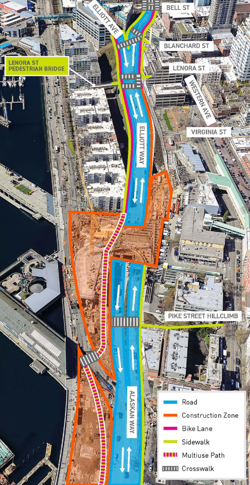 This coming Monday morning at 6 a.m., the City of Seattle will open a brand new four-lane roadway, connecting the city’s central waterfront with high-traffic streets north of Pike Place Market in Belltown. The new street, called Elliott Way, is years in the making. It sits on the former footprint of the Alaskan Way Viaduct, which included on and off ramps into Belltown before entering a now sealed tunnel underneath Battery Street.