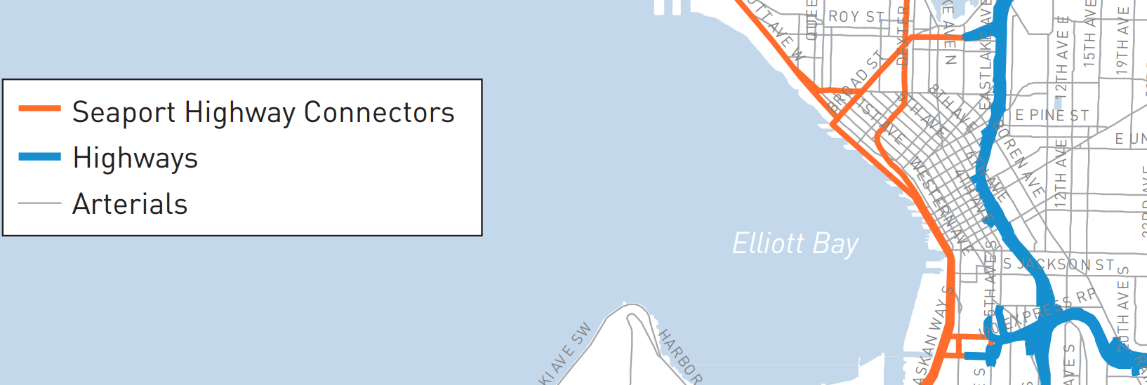 Seattle’s Freight Master Plan, last updated in 2016, does a good job illustrating why Elliott Way was created, and why it’s appropriate to label a highway connection. The broad new roadway links the state highways of SR 99 and SR 519 in south downtown and the de-facto highway corridors that serve the industrial areas in Magnolia and Ballard. Like 2020’s Lander Street overpass, eliminating the at-grade railroad crossing at Broad Street has long been a goal of freight advocates, but little analysis was done on the potential impact that the expanded general-purpose vehicle capacity will have on the city’s goals around reducing vehicle emissions. The design for Elliott Way, finalized only months after the city adopted a visionary Climate Action Plan in 2013, is at odds with the direction the city purports to want to go.