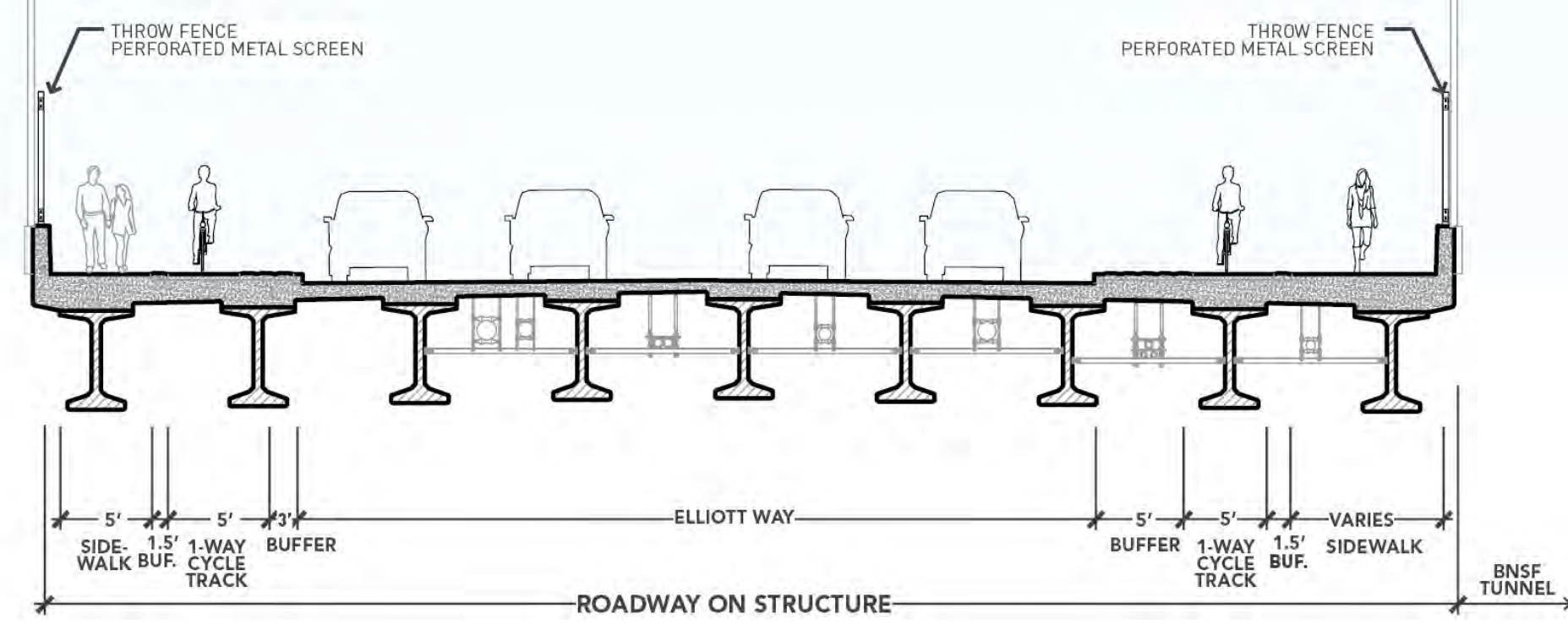 The new road will allow all vehicles heading from the waterfront toward Interbay and Ballard to bypass an at-grade railroad crossing at Broad Street. The construction has gone under-the-radar as part of the overall waterfront redevelopment project, with the promenade and Overlook Walk pedestrian connector to the new aquarium building, still under construction, taking center stage in most of the project’s renderings. When the new road has been shown in renderings and promotional images, those images have primarily focused on the view from the sidewalks, minimizing the size of the 44-foot roadway that will carry two lanes of traffic in each direction.