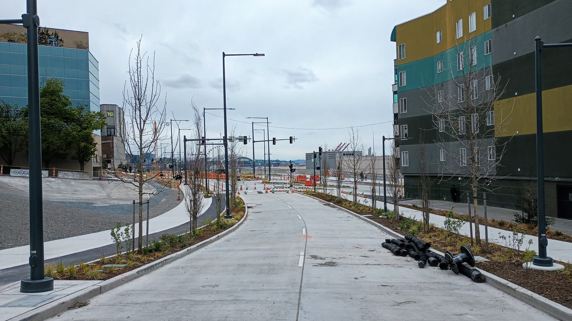 The new roadway is taking many Seattleites, including some that have been paying fairly close attention to the waterfront project, by surprise. Even former Mayor Mike McGinn, whose term in office predates the start of major design work on the project, tweeted his surprise. “So, we just rebuilt the highway?,” he said. A 2015 presentation to the Seattle bicycle advisory board, where the designs for the overall waterfront were put forward for feedback, includes only one slide where Elliott Way is included, with no designs shown for the planned bike lanes or sidewalks. The sidewalk on the Elliott Bay side, the only one that will be opening before 2024, is only five feet wide, substandard for any new development in Seattle’s downtown.