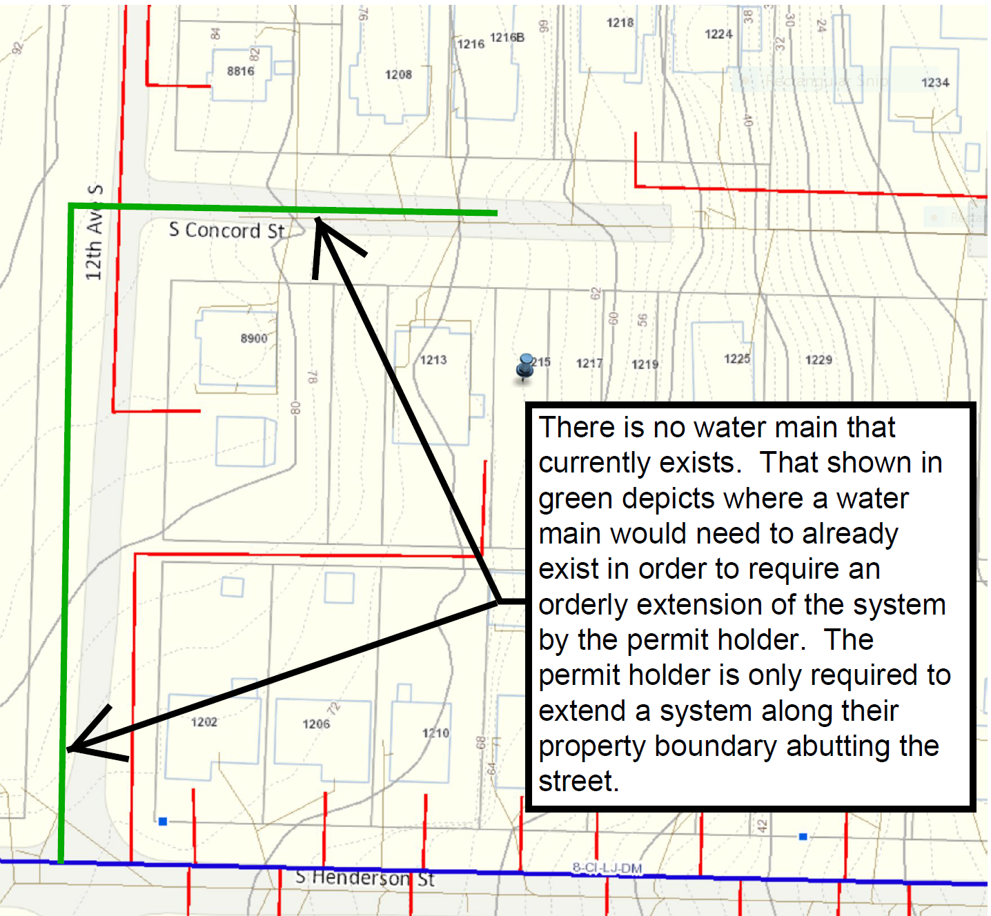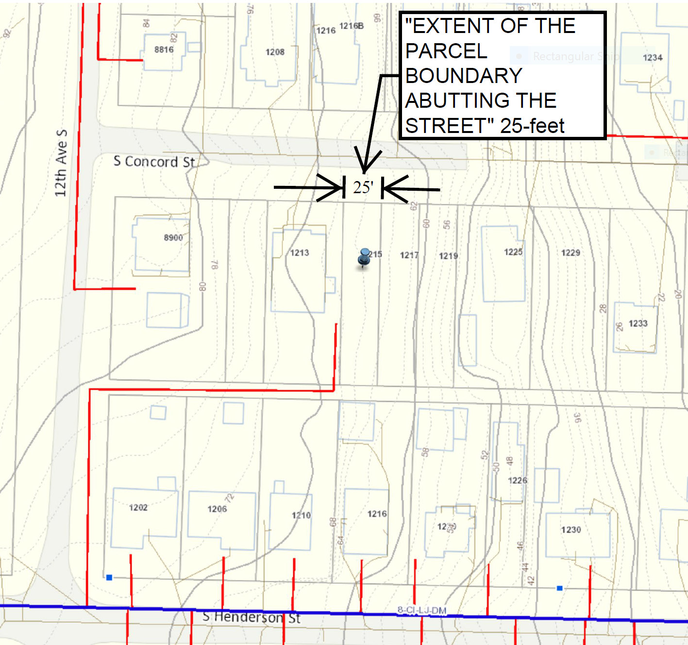 The straightforward phrase within the SMC is, “The standard distribution water main shall be constructed in the abutting street to the extent of the parcel boundary.” The important concept here is the meaning of the word “extent.” The wording is limited to only extending the water main to the extent of the parcel boundary. Below is an exhibit of what that phrase means relative to the property boundary abutting the street for the parcel located at 1215 S. Concord Street.