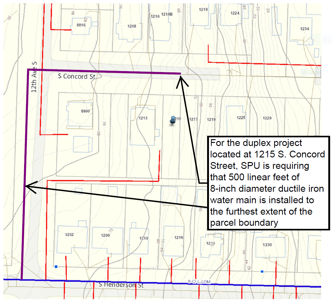 The code does not say to install a water main connecting from two intersections over, past a dozen other properties, and continue to the furthest extent of the applicant’s parcel boundary. Such should be a capital improvement paid by SPU’s required fees, not a condition. A proportional requirement would be allowing the development to extend a much less expensive, and much shallower, 1-inch residential feed to the property. This is what has happened when developing every neighboring property.