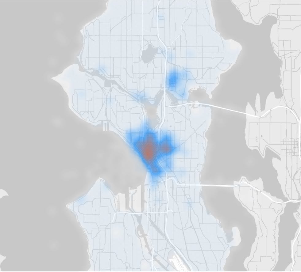 Scooter trips are heavily concentrated downtown and in a few surrounding neighborhoods, along with the University District, although a few smaller hot spots are scattered around the city. Some ridership spikes are event-based, but the daily baseline appears fairly high regardless of conditions.