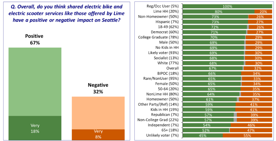 “Two-thirds of Seattle voters think the overall impact of shared electric bike and electric scooter services is positive – despite the fact that most Seattle voters are not regular micromobility users,” a poll memo stated. “Seattle voters overwhelmingly support (82%) building dedicated e-bike/e-scooter parking corrals in higher use areas of the city.”