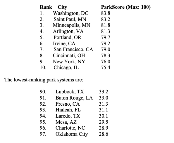 - Park investment, which measures park spending per resident; and