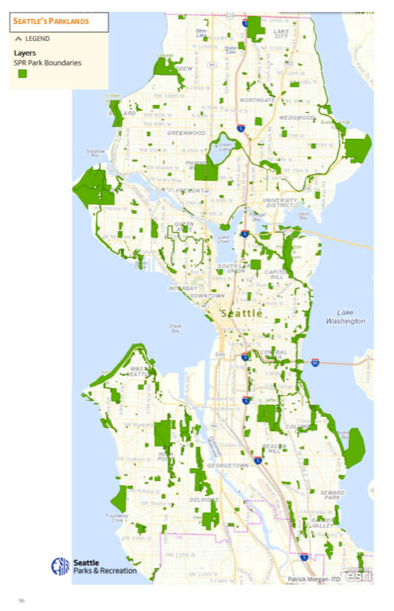 Moreover, while access to small parks is widespead, a Seattle Parks and Recreation open space gap analysis has suggested that larger parks and green spaces are not equitably distributed, with accessibility tending to be worse in lower-income areas. Marquee parks, meanwhile, tend to be ringed by restrictive single family zoning.