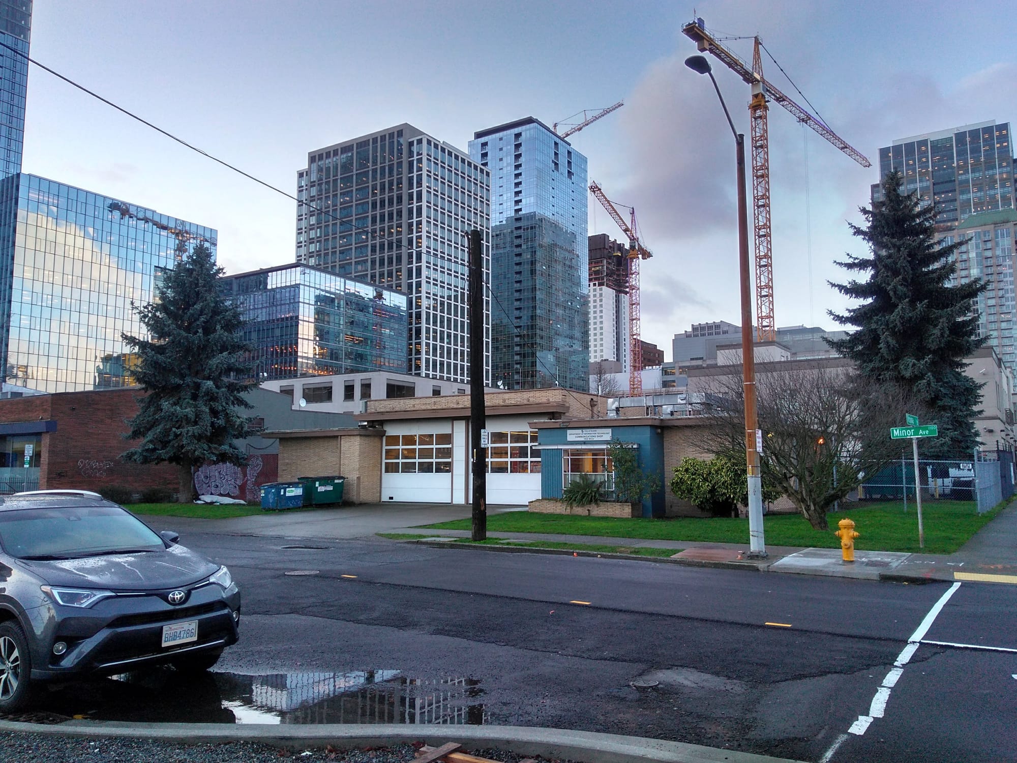 The parcel in question here houses a communication shop–a one-story structure mainly for storing vehicles while they get worked on–for the city’s information technology (IT) department. 40-story towers are sprouting all around the site, close to Denny Way and some of the tallest height limits in Seattle. In the same megablock, Miami-based developer Crescent Heights plans twin 39-story towers at 1901 Minor Ave. If that project goes forward, tower spacing rules would likely shrink the buildable envelope of the communication shop site; one of the towers would be close to the lot line and require an 80-foot buffer above the tower podium (the first eight floors).