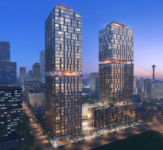 A good bet is the City will sell its site to Crescent Heights since the developer has a bigger proposal it’s been simultaneously working through the permitting process that includes the City site–not to mention an award-winning experimental design they’ve been kicking around. The full block proposal has 943 apartments and 662 underground parking spots, compared to the 737 apartments and 424 parking spots planned on the smaller lot. Like the smaller proposal, it cleared design review in 2016, but still needs a master use permit. Both proposals vested before the Seattle City Council passed the Downtown/South Lake Union rezone, meaning the Mandatory Housing Affordability (MHA) requirements wouldn’t automatically apply to them.