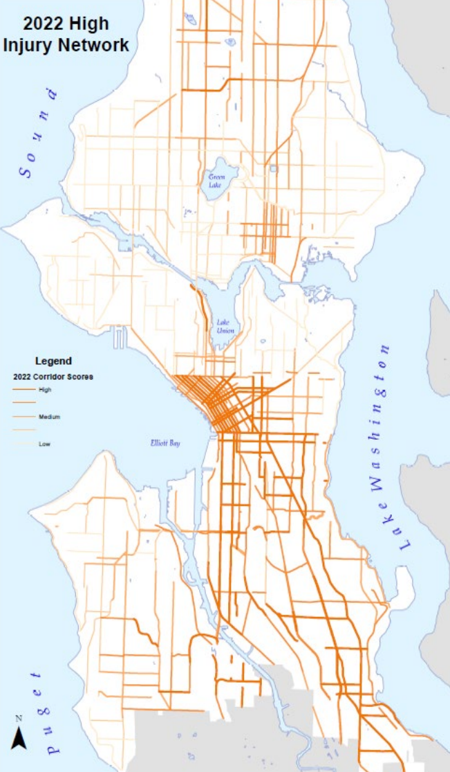 While the locations Saka mentioned may be “hot spots” for problematic speed racing, many of them don’t rank very high on the list of dangerous streets when it comes to overall collision rates, as evidenced by SDOT’s high-injury network. These are the streets in the city with the highest frequency of serious and fatal crashes, with downtown streets and high-speed corridors in SoDo and the Rainier Valley highly overrepresented.