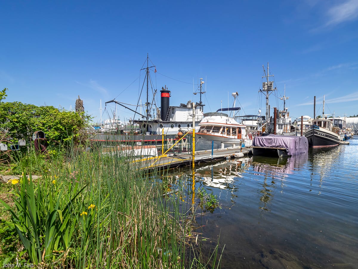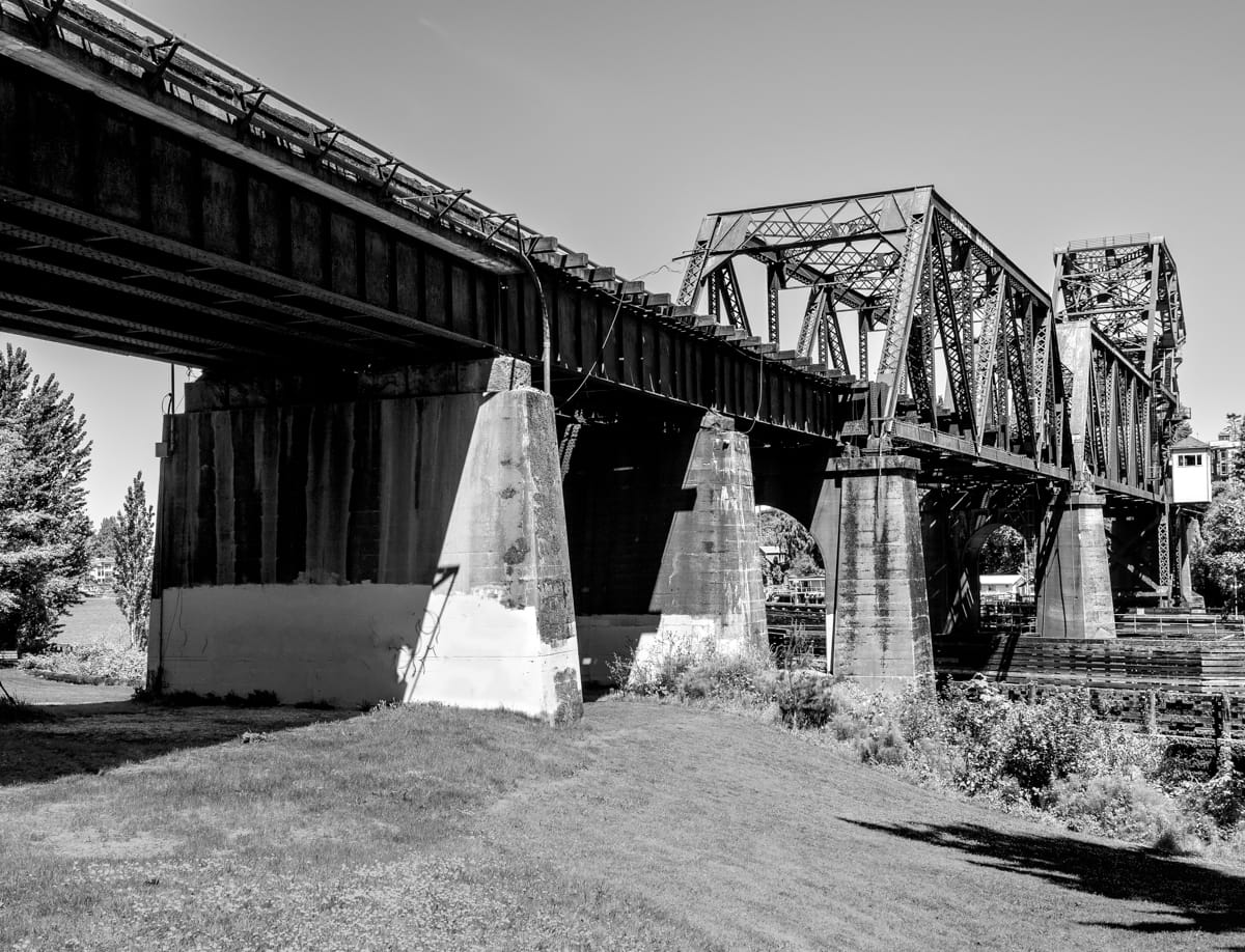 When exploring a shoreline in Seattle you often find yourself at the low side of an escarpment, and in the case of the 5th Avenue North and the South Ship Canal Trail Street End (#91), you are awed by an underbelly view of the Aurora Avenue Bridge hovering about 150 feet above. The juxtaposition of the relative serenity of the water with the bridge’s extraordinary structure is breathtaking. While this is no surprise given the bridge’s iconic presence on the skyline, the bucolic houseboats, placid water, willow trees, and waterfowl beneath it are.