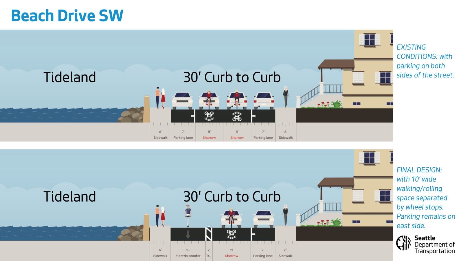 In 2020, along with experiments elsewhere in the city in opening streets to people that included closing Lake Washington Boulevard and Golden Gardens Drive to through traffic, Beach Drive saw added signage that simply codified what had been a longstanding practice of people using the roadway, given the incredibly narrow sidewalk. When that proved successful, there was considerable momentum to make improvements permanent with infrastructure. A video created by project boosters in 2020 highlighted problems like street racing that seemed like they could have a solution in physical changes to the roadway.