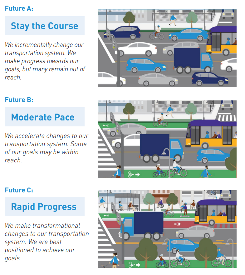 The so-called “key moves” in the plan are all likely to have broad support, especially based on the city’s previous rounds of outreach. Framed under the umbrellas of safety, equity, climate, mobility, livability, and maintenance, many of these are already well underway. The top action under safety, reducing vehicle speeds, is one that seems to have broad support and has shown results in the real world. And it’s hard to argue with improving air quality and health outcomes by promoting more sustainable travel options.