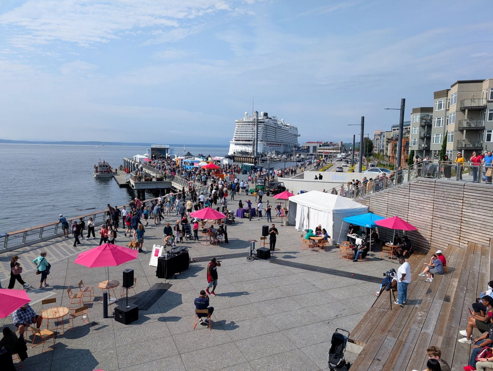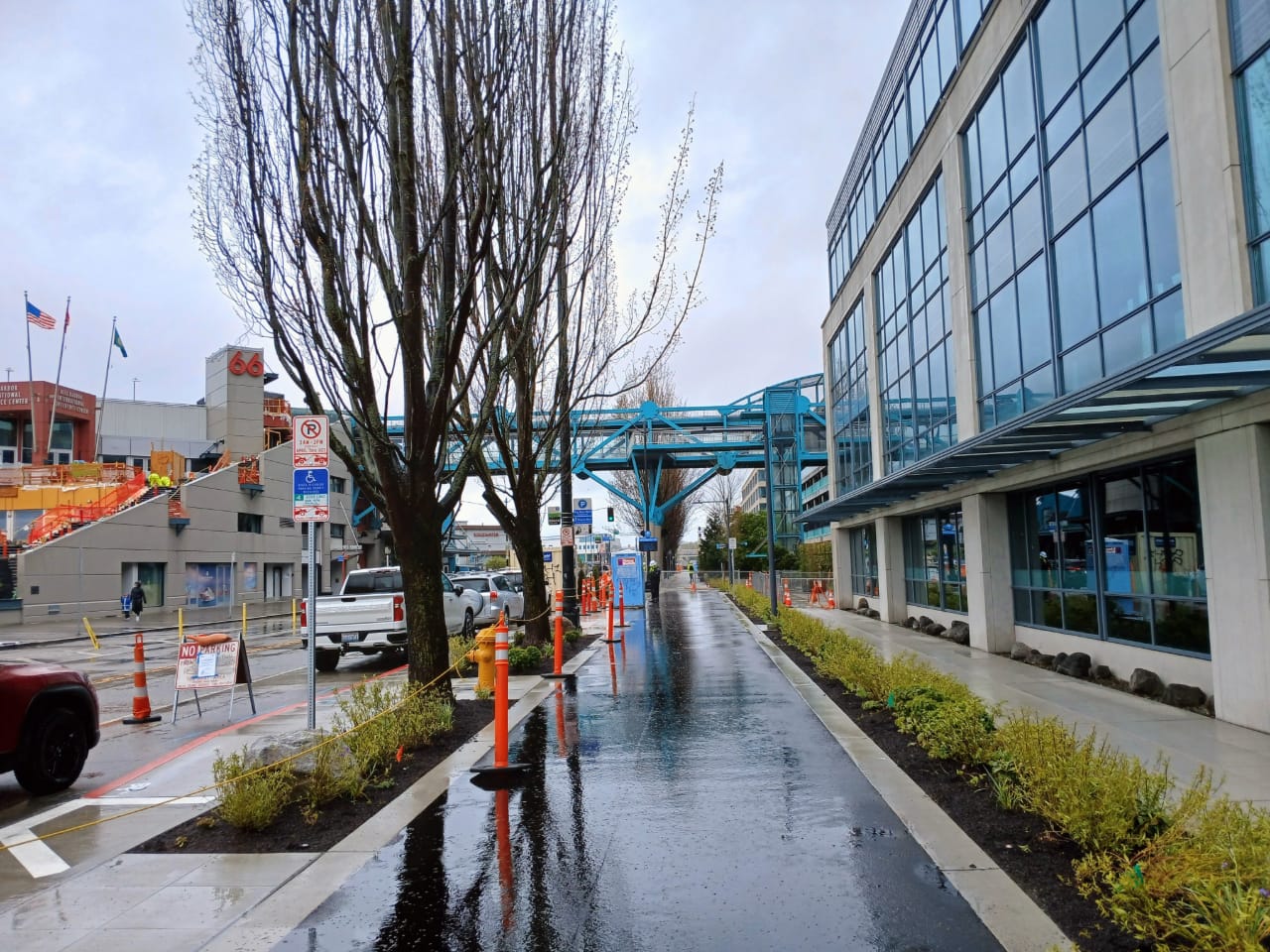 The bike lane detour is needed due to an arrangement with the Port of Seattle that sees the city-funded protected bike lane along Alaskan close for cruise ship loading and unloading, sending riders across the street. Readers of The Urbanist may recall that the original design of that bike lane, which opened last year, would have required riders to cross the street at all times, cruise season on or off.