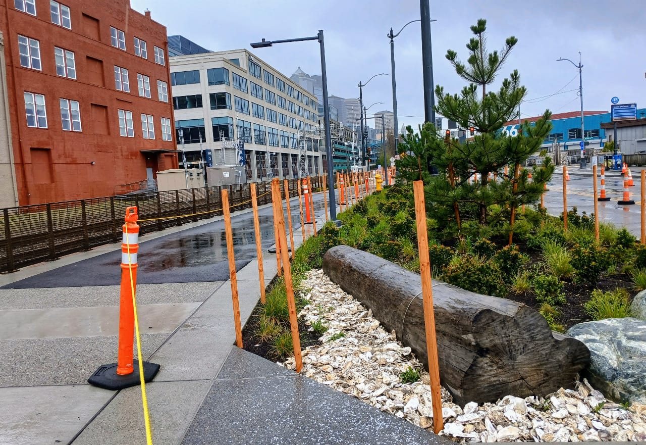 The Elliott Bay Connections team had a tight timeline: they were tasked with building a trail built between the end of last year's cruise season and the start of this year's, waiting until SDOT's bike lane project had fully wrapped up to start on the other side of the street. And they made it across the finish line with not a day to spare.