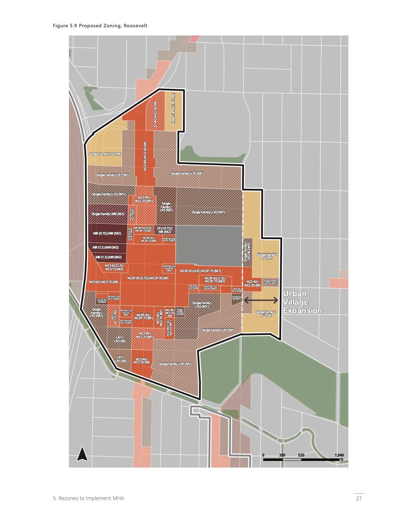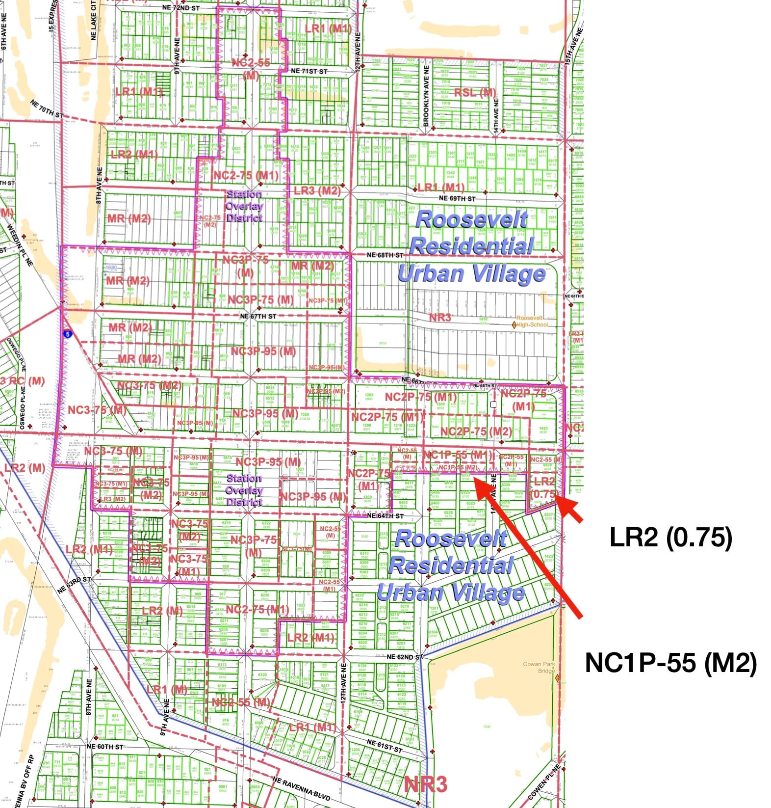 The lone location of LR2 (.75) zoning is a block east of the Roosevelt Light Rail Station. Low Rise 2 designations allow 40 to 50 foot high multifamily residential near urban villages.