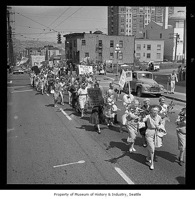 Among the protesters was architect Paul Thiry, a First Hill resident and supervising architect of Seattle’s 1962 World’s Fair. Earlier in 1961, Thiry stepped down from the Seattle Planning Commission because of his opposition to the freeway plans, and now he marched in the hope that what he saw as a fatal city planning error could be at least partly remedied by lidding two segments of the freeway: Madison to University Street and Pike Street to Olive Way.