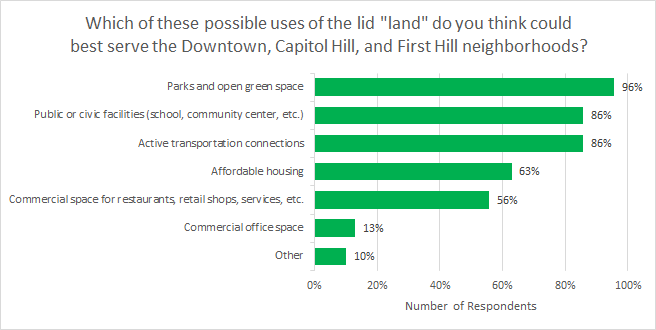 Rather than advocating for a specific use for the new land created by lidding I-5, the campaign advocates for the master plan for the project to be created with deep and equitable public engagement. As a precursor to future public engagement efforts, Lid I-5 has been conducting its own polling. A recent survey of about 70 participants indicated strong support for using the lid to create public amenities like parks, schools, and walking and biking connections. Overall, participants indicated a strong preference for green space, expressing desire for the lid to provide space for urban gardens, green infrastructure, affordable housing, and other solutions for environmental and noise pollution rather than commercial buildings.