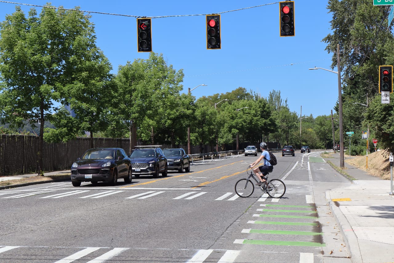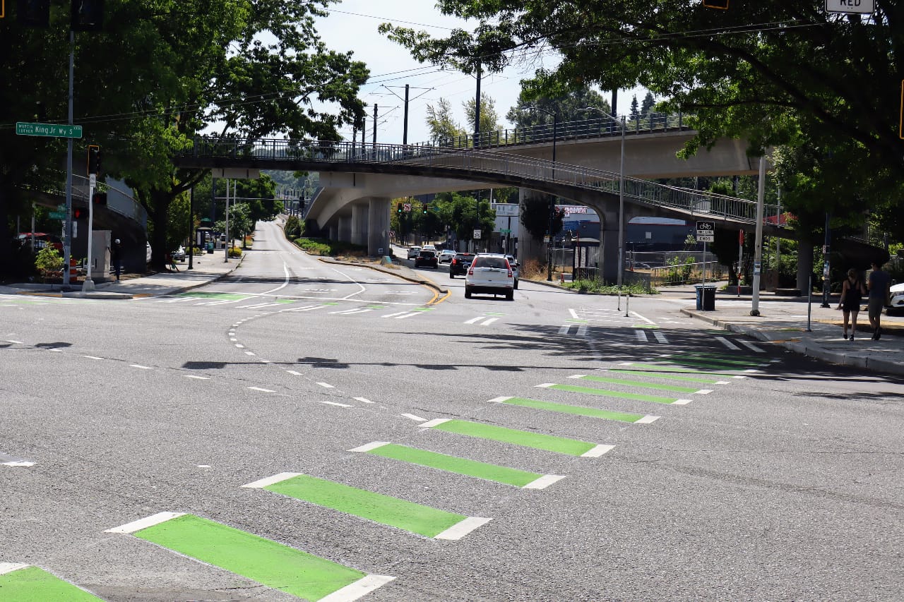 On July 30, the Seattle Department of Transportation (SDOT) announced that it had reached “substantial completion” on a brand new protected bike lane and traffic safety project connecting the I-90 Trail to the Mount Baker light rail station along MLK Jr Way S. An improvement for all modes of travel, the MLK Way project reduced the number of general purpose lanes on the street from two in each direction to one, added a bike lane on either side of the street, and filled a gap in the sidewalk network.