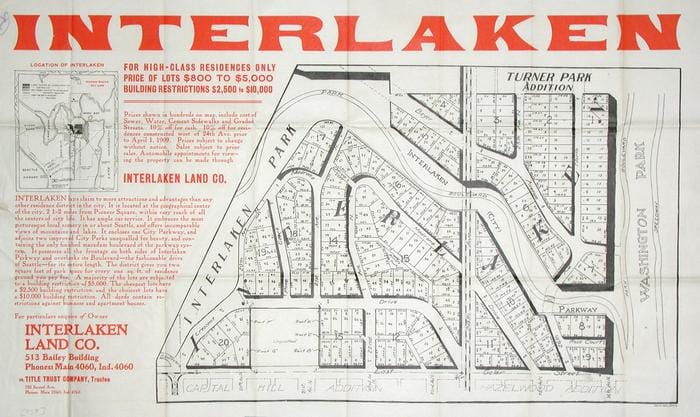 Other maps take a bit of interpretation to appreciate the horrors they show because the accompanying text is laced with old euphemisms. Like many developments that built the Seattle Times’ advertising fortune, this promo and map for Interlaken makes mention of the site being “restricted.” In that era, the restrictions were racial covenants. The signed and officially recorded deeds included text similar to that in Blue Ridge, which stated: “No person or persons of Asiatic, African or Negro blood, lineage, or extraction shall be permitted to occupy a portion of said property.”