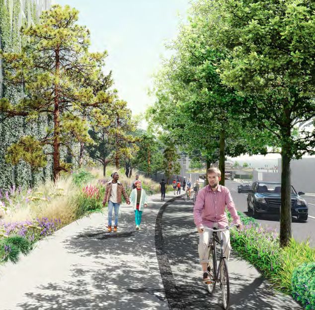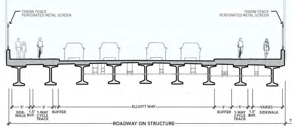 The good news: Elliott Way will have separated bike facilities on each side of the street, raised and separated from vehicle traffic, and distinguished from the decent-sized sidewalks. Landscaping should also make the ride more pleasant, though we likely shouldn’t read too much into rosy renderings. However, green walls planned to cover up the backside of the Market Garage will be a welcome sight.