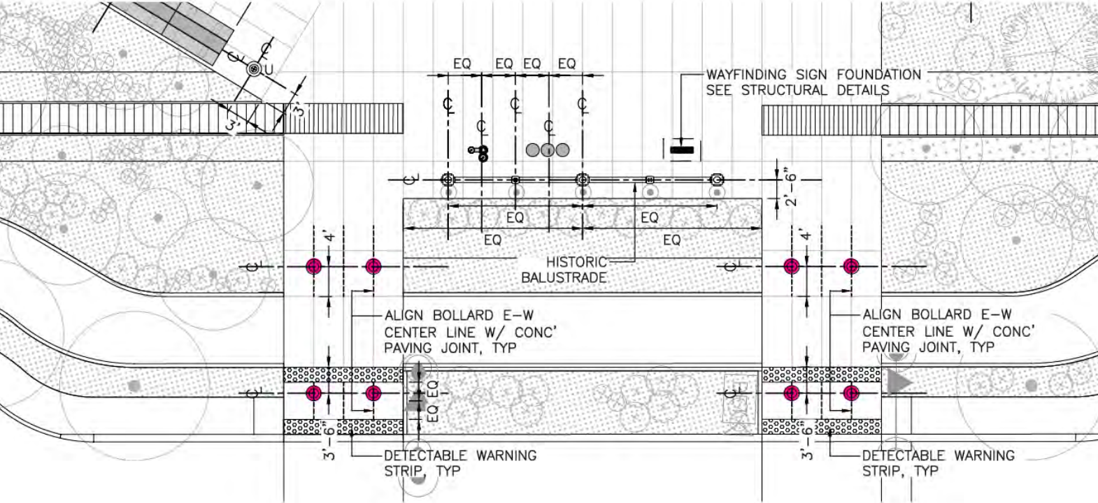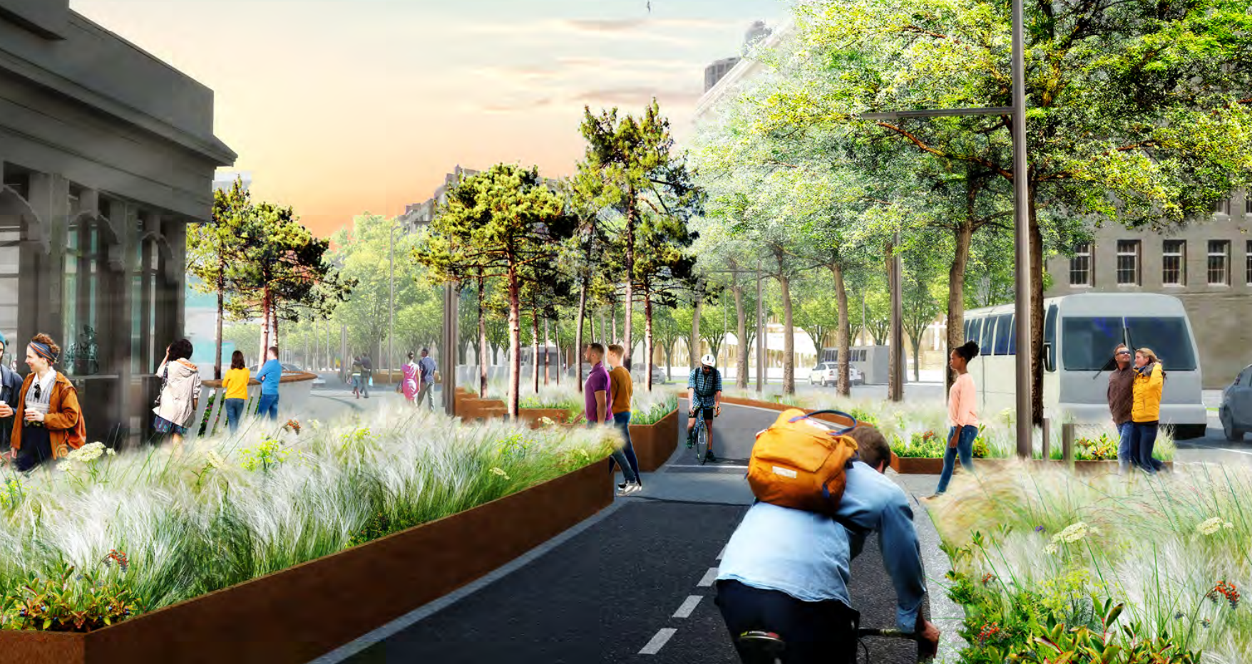 Lack of bollards isn’t merely an aesthetic difference: their absence makes an event where a driver finds themselves on the bike trail a virtual inevitability, either by the driver’s error or their ill-intent. The narrowness of the trail, combined with the fact that the trail will be hemmed in on either side by planters, could spell disaster.