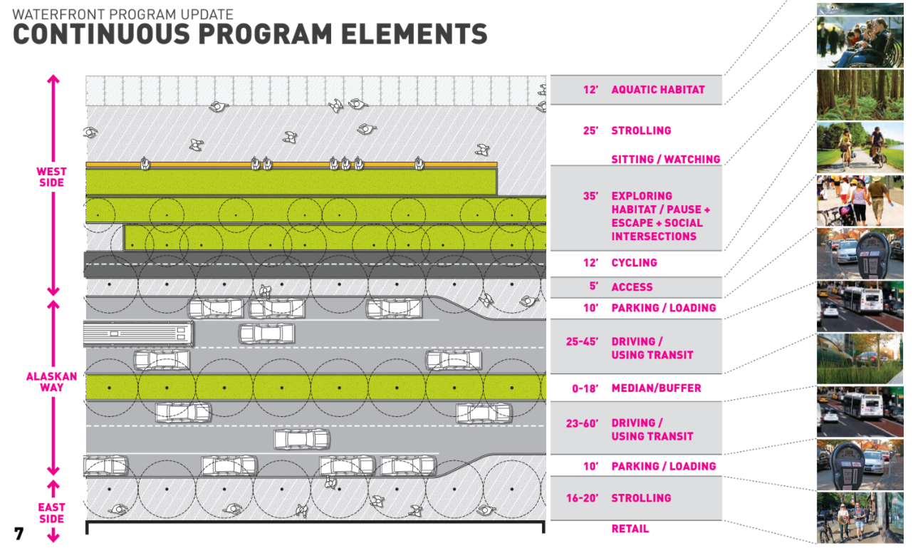 In 2014, the newly created Office of the Waterfront presented a unified program concept laying out exactly how space on the new waterfront would be divvied up after the Alaskan Way viaduct was removed. That’s when 12 feet became the promise — not a random number. The National Association of City Transportation Officials (NACTO), released its urban bikeway design guide just a few years earlier, a move that had been considered a big step forward in design guidance for cities. It recommends a “desirable” minimum width of twelve feet, not including shoulders or buffers.
