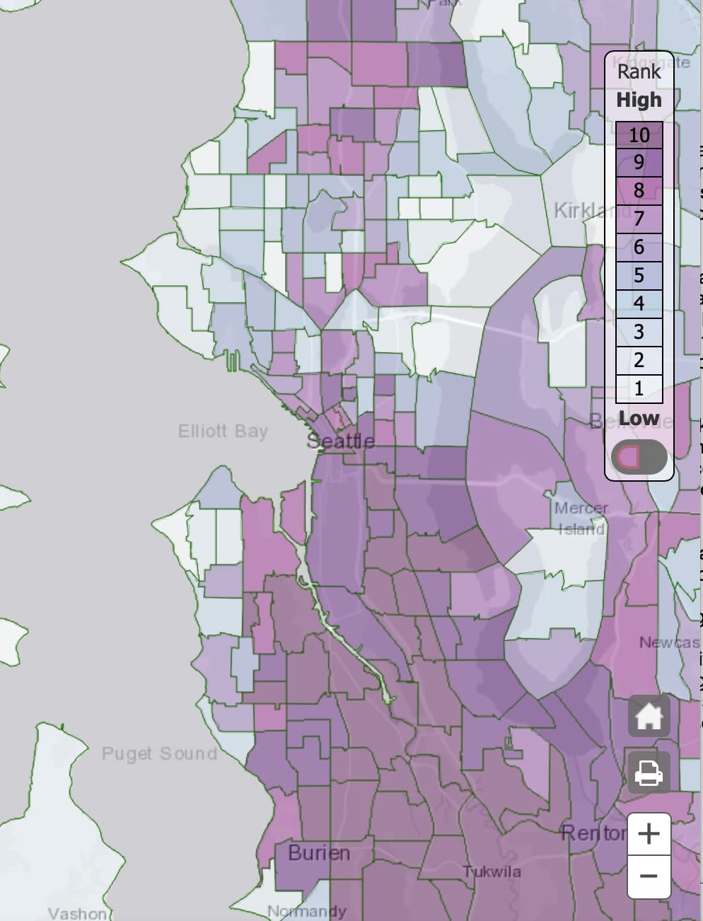 The answer is poor communities of color. Due to impoverished communities bordering I-5 and various airports, there is a solid band of “HIGH (10)” environmental risk neighborhoods stretching from SeaTac to the stadiums. No census tract north of Downtown hits that risk. Only two North Seattle tracts are level 9 while there are a dozen in the south.