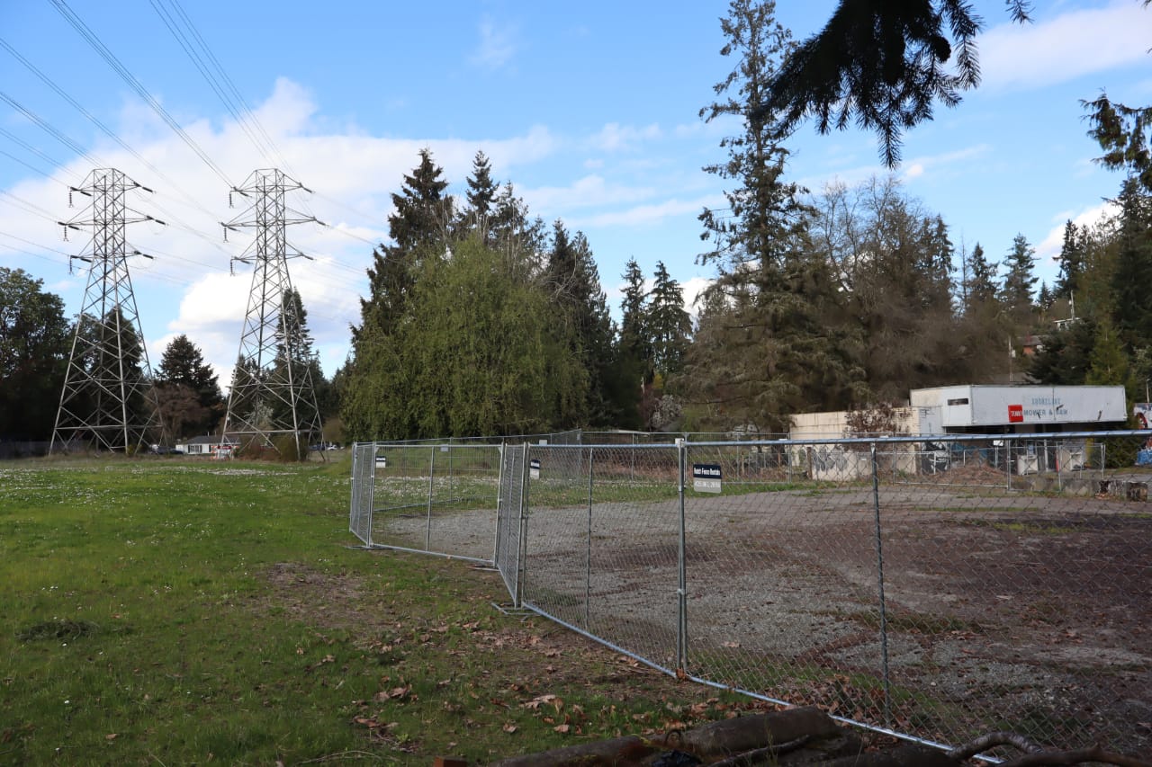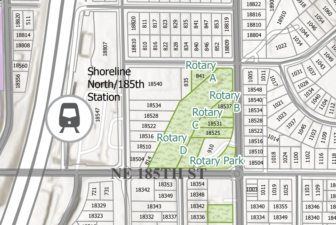 A five-minute walk east of the light rail station, Shoreline's Rotary Park isn't really a park most people would spend much time in β it's a small triangle of grass, with a few flowering bushes and trees. Next door is a shuttered lawnmower repair shop and parking lot, sitting behind a fence. Further east are some Seattle City Light power lines.