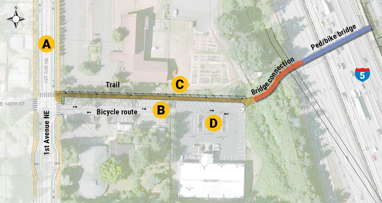 Shoreline is planning a new pedestrian and bicycle bridge across I-5 to connect separated communities and transit riders to the Link light rail station opening in 2024. An online open house highlights several design options that the City is considering, including conceptual layouts, renderings, and tradeoffs. The planned bridge will be located at NE 148th St, connecting the Parkwood and Westminster Triangle neighborhoods. When the Lynnwood Link extension opens, a light rail and bus station will open on the east side of I-5 situated between NE 145th St, NE 148th St, and 5th Ave NE.
