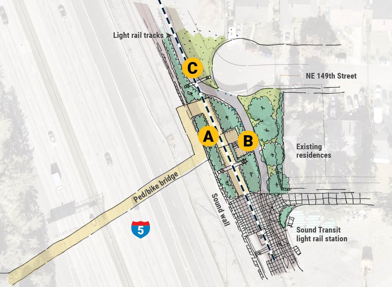Shoreline has also drafted some options for how the east side of the bridge would connect to the Trail Along The Rail and station. The three options differ in how the bridge ties into these connections, either directly or switching back.