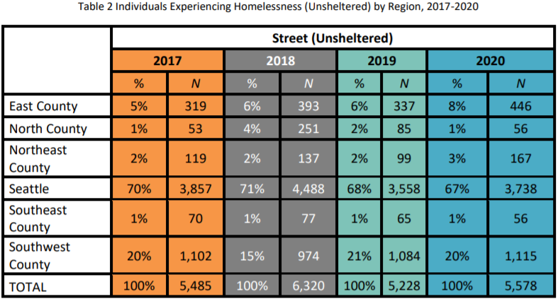 Annual one night counts show the issue of homelessness touches the entire county and the number of homeless people continues to stubbornly climb, approaching 12,000 in January–even before the pandemic tanked our economy and wiped out tons of jobs. The 2020 count showed Seattle shelters 4,428 of the county’s 6,173 sheltered homeless population–72% of the sheltered population.