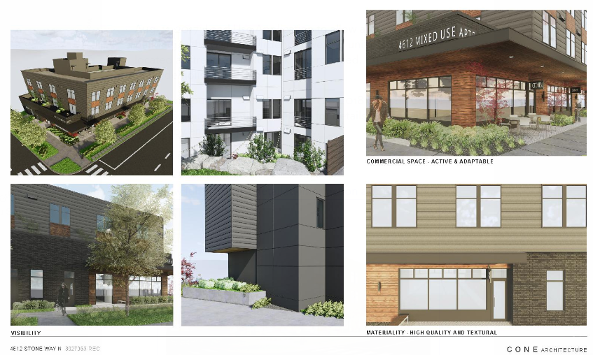 Though only three stories tall, this building provides significant density, and it upgrades the intersection of Stone Way N and N 47th St from a parking-dominated void to lively urban storefronts along a continuous sidewalk. Wallingford could use a lot more projects in this vein. Attend the March 26th meeting or email comments to design review planner David Landry to support this project and the increased housing options it brings to Wallingford.