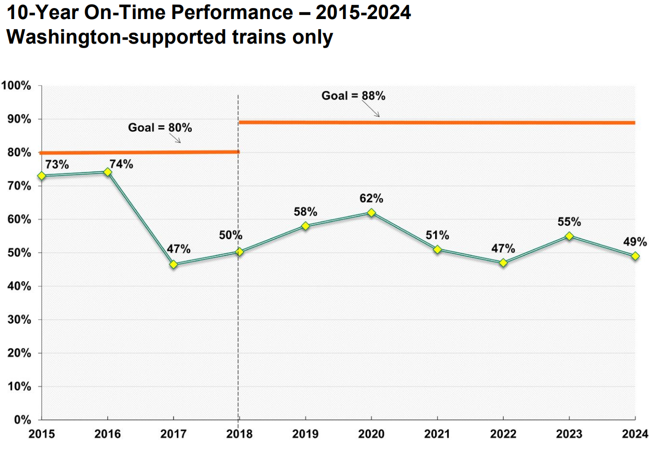 Having to negotiate with BSNF for use of the corridor remains a main reason that Amtrak Cascades boasts incredibly poor performance when it comes to staying on time. The most recent performance report released by WSDOT, from 2024, showed on-time performance had once again slipped below the 50% mark after a brief increase to 55% in 2023.
