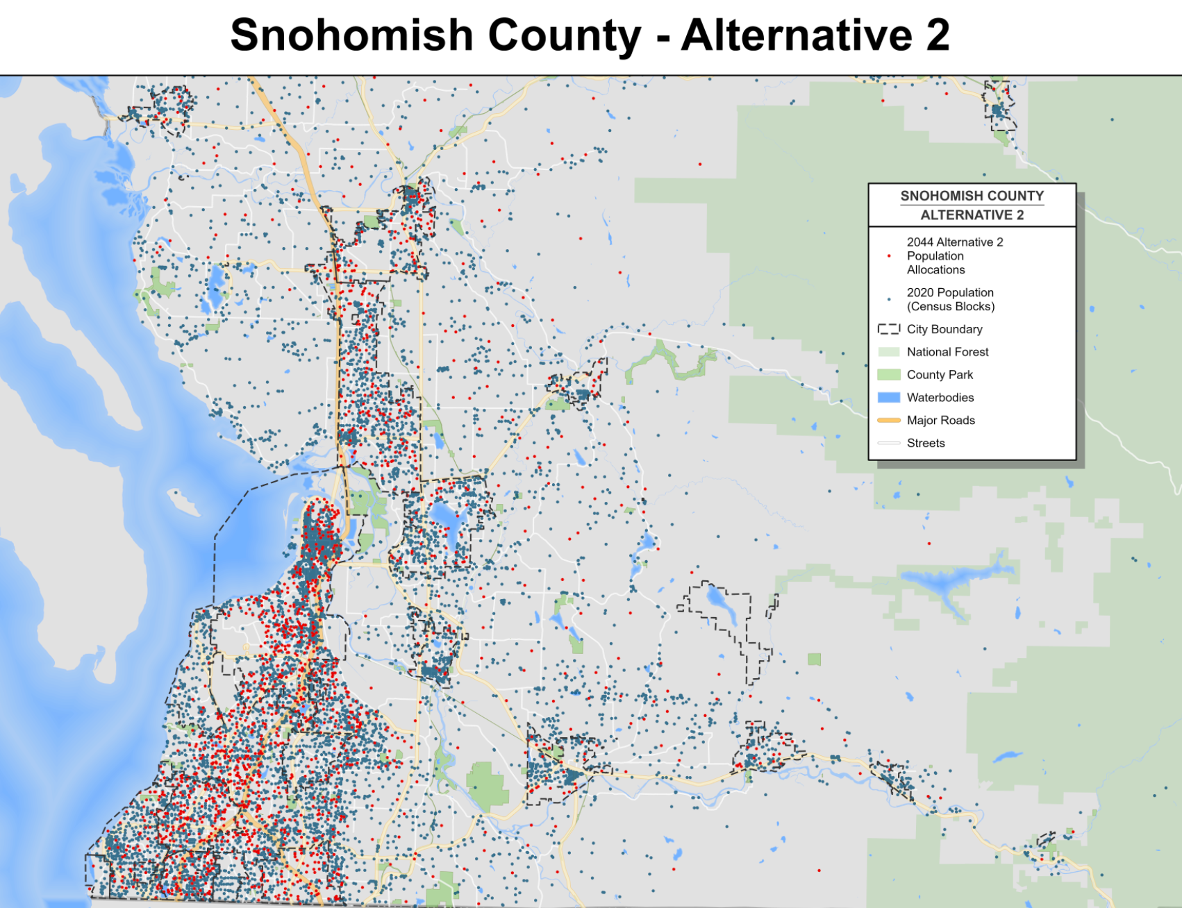 - Under the no action Alternative 1 scenario, existing development regulations and zoning would fail to support urban population growth targets allocated to the county and exceeds rural population growth targets (accounting for 8.5% of county population growth), but is predicated on the idea that lower population growth materializes than expected.Under Alternative 2, the county would focus population growth in the Southwest Urban Growth Area (SWUGA), particularly around high-capacity transit (light rail and bus rapid transit expansions are planned in this area). This would require rezones, changes to development standards, and redesignating some residential areas to higher intensity ones. Rural population growth would be fairly limited (accounting for 4.5% of county population growth), but there could be minor urban growth area boundary adjustments. As a whole, it is in line with the regional vision for growth.