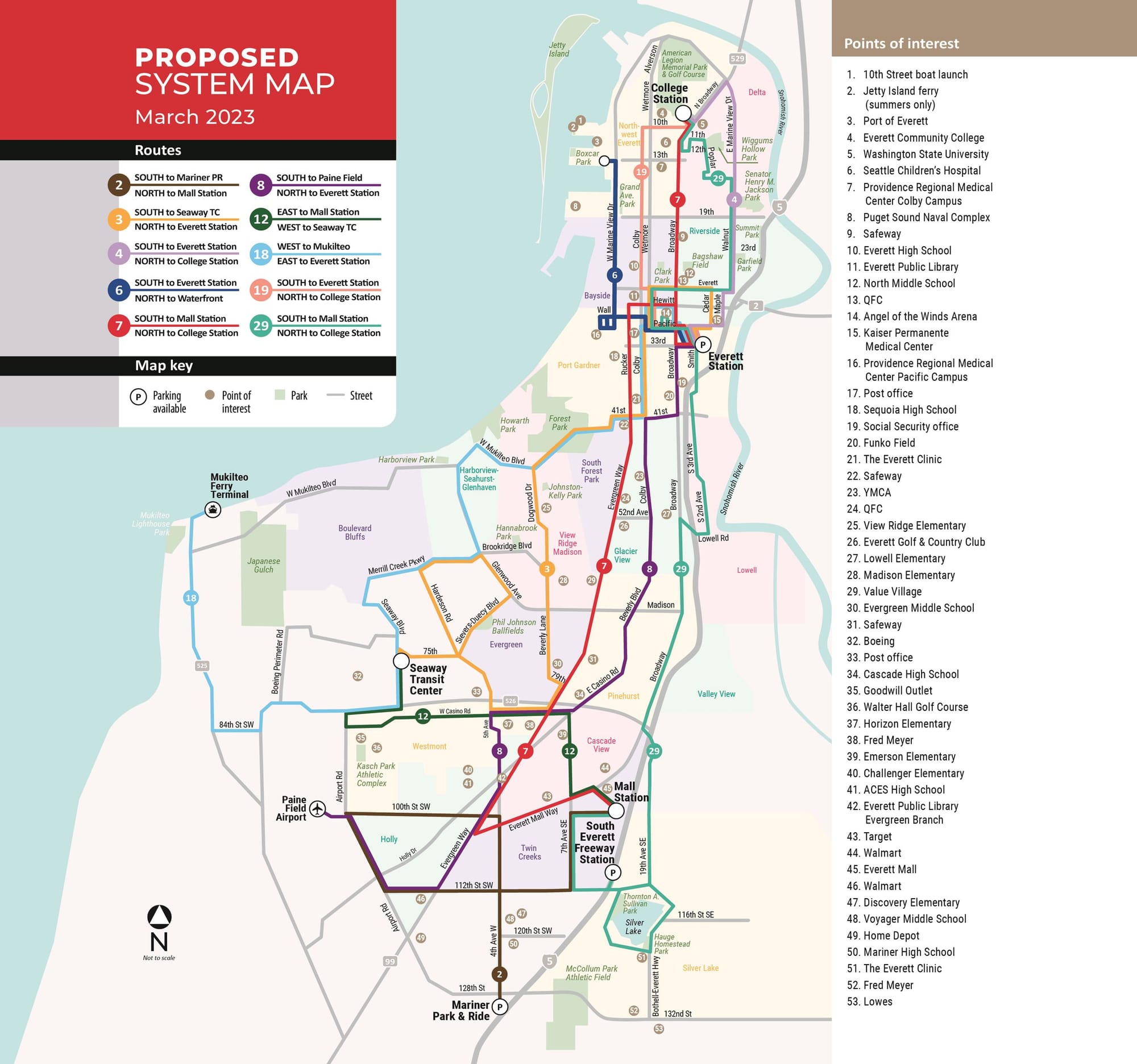 | 19 | This route would be a new service running College Station in North Everett to Everett Station via Colby Avenue and Downtown Everett. Service would operate seven days a week with 30- to 60-minute frequencies on weekday and every 60 minutes on weekends. |