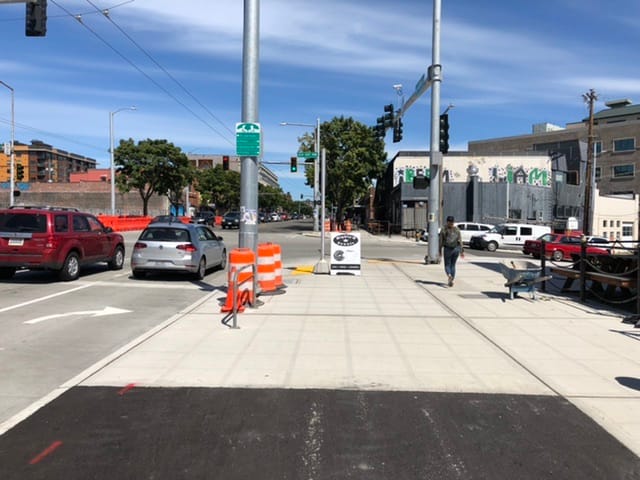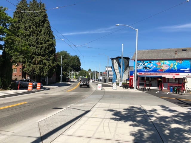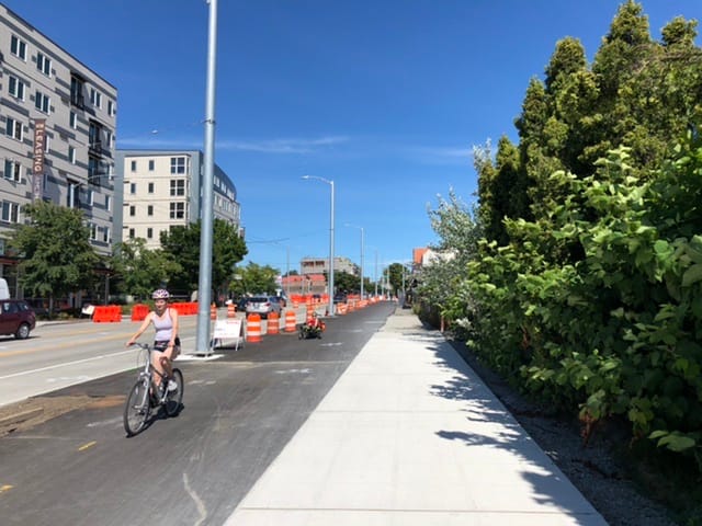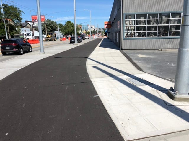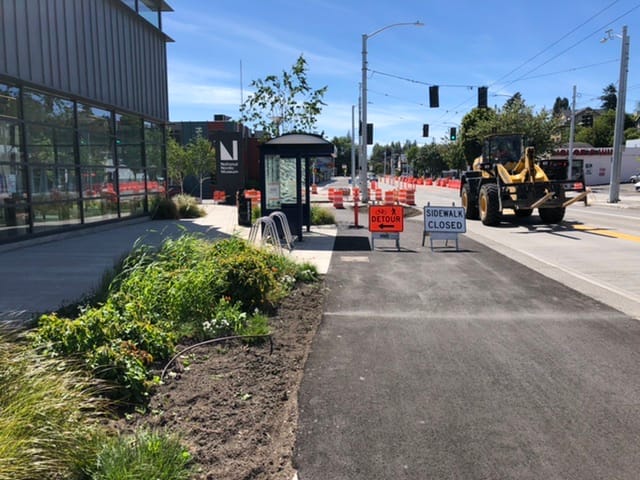 One location where the road-side sidewalk is sacrificed is at the National Nordic Museum. This allows the trail to avoid the very large and very new bioretention plantings installed as part of the museum’s construction. As these plantings grow, it may emphasize how installation of the trail removed several very large trees and left a bare feeling to the road. Fortunately, there are parallel parking areas that may be re-examined if the need for planting arises.