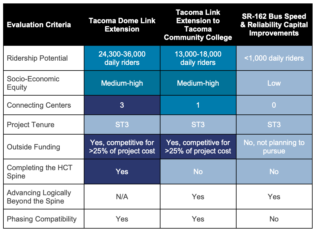 The Everett Link light rail extension is one of the highest performing projects in the evaluation even though ridership is modest. It benefits from being a key component of the regional spine, possibility for third-party funding, connecting many regional centers, and socio-economic considerations. The Ballard and West Seattle Link light rail extensions and the corresponding new Downtown Seattle light rail tunnel also score well, spurred in large part by the connection to regional centers, high ridership, and potential for third-party funding. Curiously, the new tunnel is not considered a part of completing the regional spine–a point that Seattle Mayor Jenny Durkan raised during the meeting–even though it is a necessary component for capacity and reliability for the Tacoma Dome and Everett Link extensions. In years past, there was debate over whether other subareas in the suburbs should help foot the cost of the tunnel.