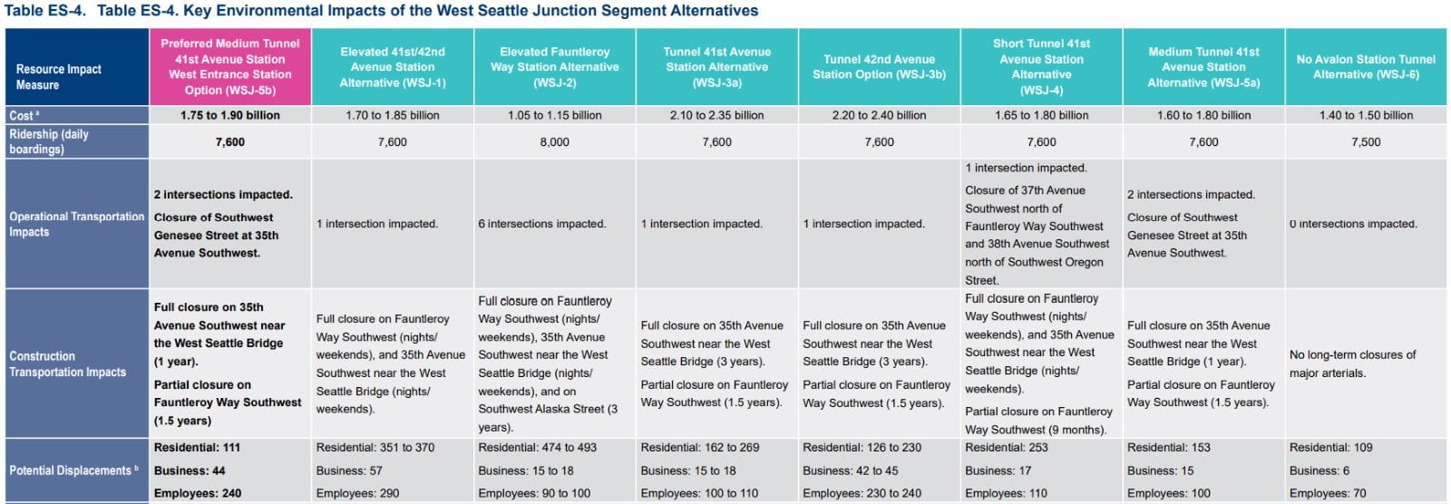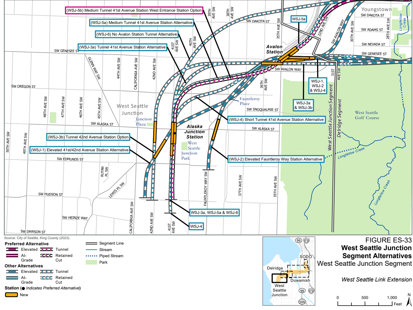 Now, the preferred alternative has been advanced to 30% design, and new “bottom-up” cost estimates peg the project at $6.7-$7.1 billion. Those bottom-up estimates entail a deep dive on specific project elements and site needs, and broader market conditions that are impacting large construction projects around the county, rather than blunter “unit cost” estimates the agency used in the FEIS. Unlike the 41st Avenue tunnel, an elevated Fauntleroy option wasn’t advanced to 30% design, so apples-to-apples comparisons are harder to make now.