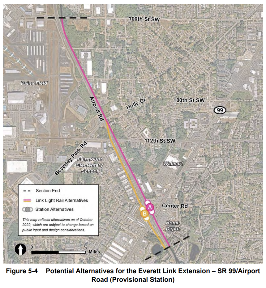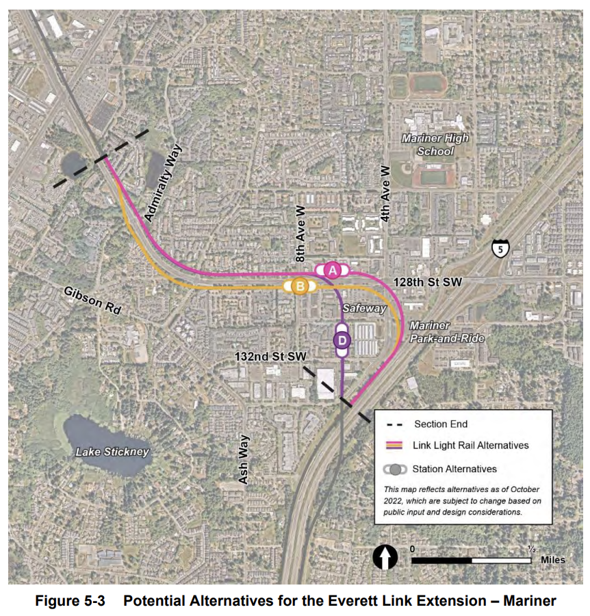 Just a bit further up the line, Sound Transit is tasked with looking at two alternatives for Mariner. MAR-D would pulverize many apartments and several businesses as it emerges from the south side of I-5 and reaches toward the Safeway commercial plaza just so it can be more centrally located and offer another massive off-street bus facility that isn’t needed. MAR-B is comparatively delicate, at least until it heads up 128th Street SW, by skirting most buildings and being better centrally located near 8th Avenue W on 128th Street SW. But west of here, both alignments continue via private property and require many more residential displacements.
