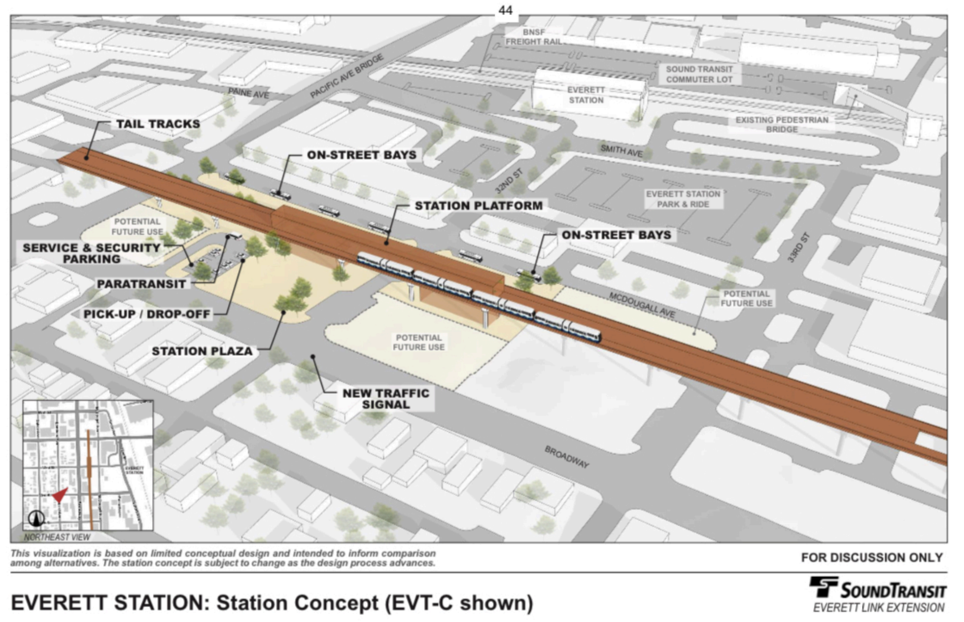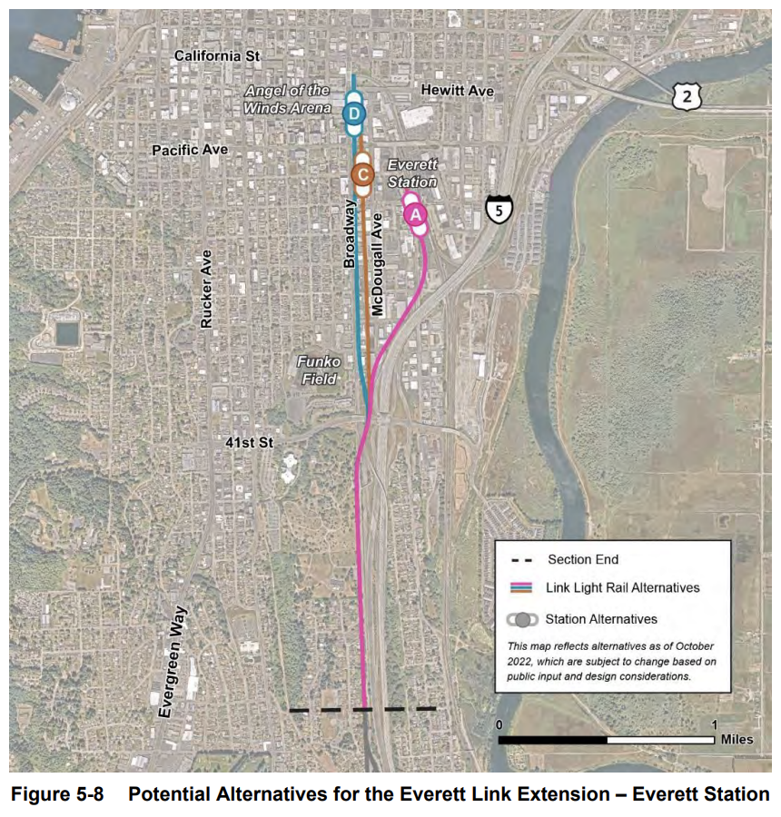 And then there are the decisions around an Everett Station station. Preferred alternatives (EVT-C and EVT-D) would actually abandon Everett Station and all the benefits it offers in order to locate yet another station near a massive jail complex or the Angel of the Winds Arena (and a possible new minor league baseball field). Both station alternatives would involve wiping out the blocks between Broadway and McDougall Avenue to build guideway and station facilities, at the cost of hundreds of jobs and low-income residents. Those station facilities would try to duplicate many of the features already present at Everett Station, such as bus bays, security and operations parking, and kiss-and-ride zones.