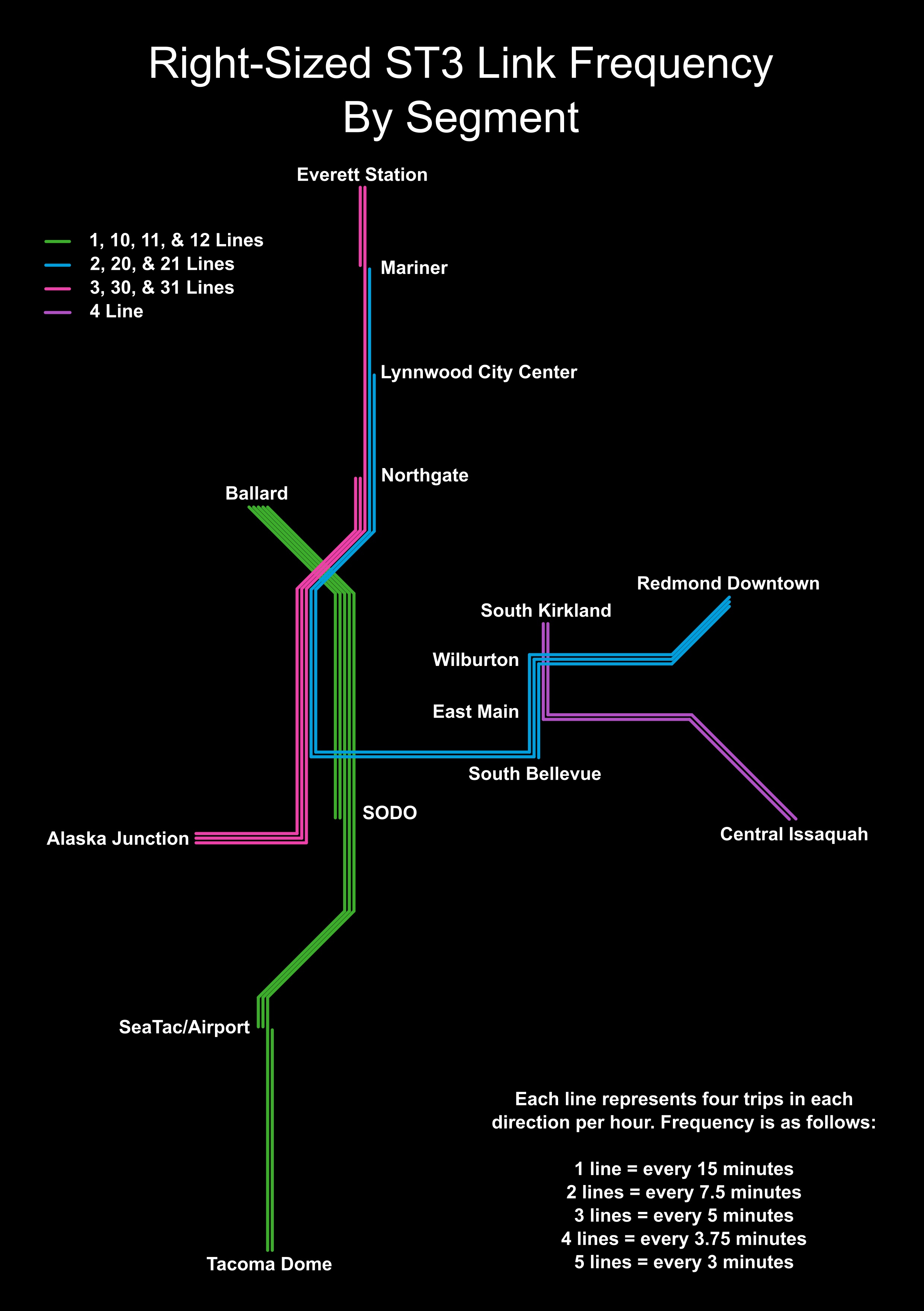 So far, Sound Transit is assuming train frequencies will remain largely uniform across a system set to grow to 116 miles. In 2023, Urbanist contributor Stephen Fesler laid out a plan to right-size service patterns, by running extra service in the busy core of the network and economizing elsewhere. While presenting political challenges, Sound Transit may eventually be forced to think along these lines to stretch its operations dollars farther.