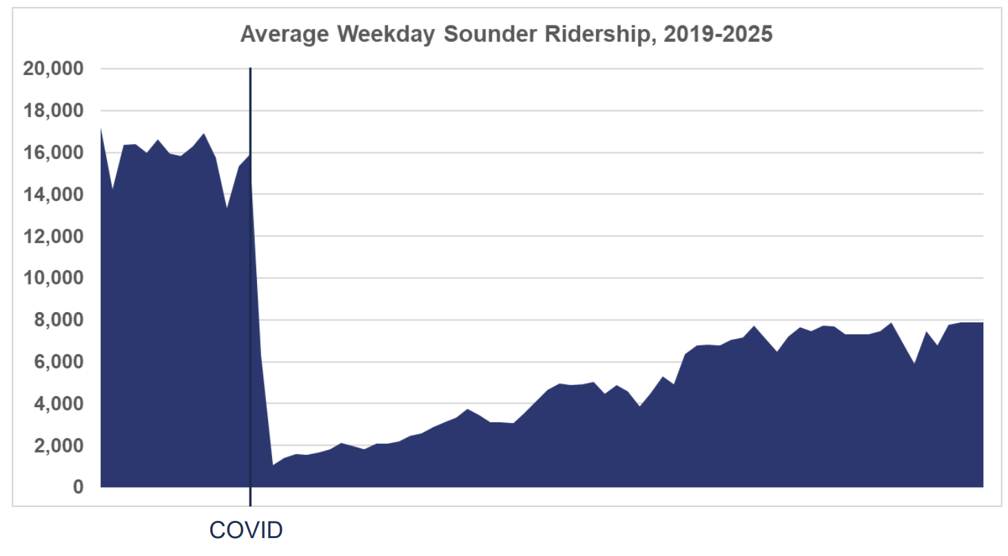 With Sounder ridership settling into a clear post-pandemic holding pattern — at less than half of what it was in 2019 — the need to accommodate large numbers of peak riders on trains and platforms is much less pressing. Instead, broad agreement exists among both board members and the public that Sounder should be shifting to an all-day service model that matches rider demand.