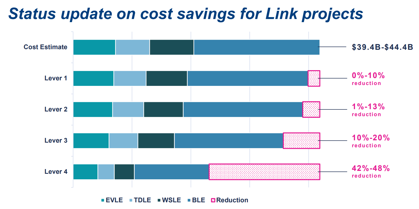 Sound Transit staff have been putting cost savings measures into four different tiers, or “levers.” The levers ramp up in complexity and potential impact on riders or agency operations: lever 1 is relatively straightforward changes that are clear no-brainers. Lever 2 changes are slightly more complex, and lever 3 changes are the type that would need buy-in from local governments and other stakeholders due to their significant impact on the project’s scope and footprint.