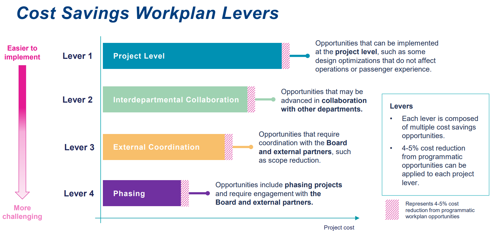 But the bottom line, as shown to the board last Thursday, is that pulling levers 1 through 3 right now only unlocks around 10% to 20% of cost savings, which is below what the agency has said is needed to stay on schedule. Without creative problem-solving, the agency will be forced to pull lever 4, and the battle over which projects see phasing could take over the work happening as part of the Enterprise Initiative.